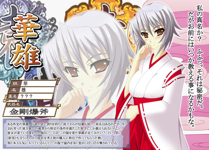 華雄 ( か ゆう ) とは、後漢末に 董卓 に仕えた人物。 正史と「 三国志演義 」で、立場やキャラクター像が大きく違うのだが、 いずれにおいても「かませ犬」というポジションが共通している 。 出生、字は不明であり、その記述があるのは敵軍であるBaseSon, girl, koihime musou are the most prominent tags for this work posted on February 15th, 17 恋姫†無双シリーズの登場人物(こいひめむそうシリーズのとうじょうじんぶつ)では、BaseSonから発売されたアダルトゲーム『恋姫†無双 〜ドキッ☆乙女だらけの三国志演義〜』『真・恋姫†無双 〜乙女繚乱☆三国志演義〜』『真・恋姫†無双 〜萌将伝〜』、およびその関連作品に登場する